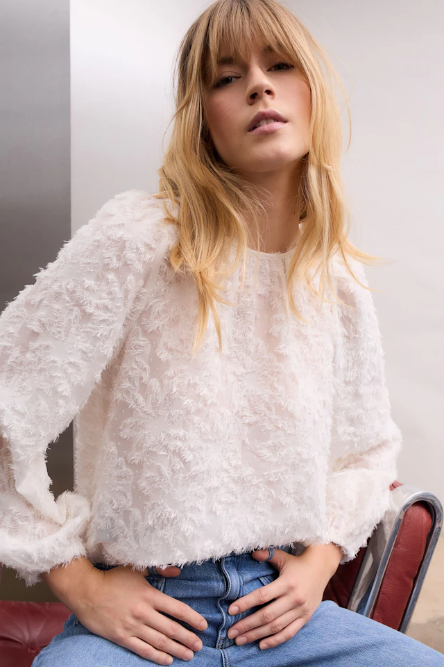 Weiße Damen-Bluse mit langen Ärmeln und strukturiertem Stoff, ohne Model abgebildet. Weiße Damen-Bluse mit langen Ärmeln und strukturiertem Stoff, ohne Model abgebildet.