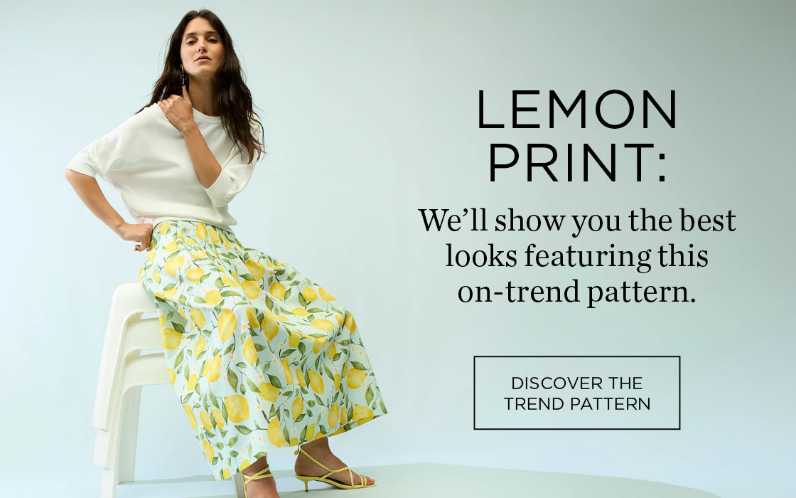Frau mit weißem Pullover und Midirock mit Zitronendruck. Rechts Schrift: Zitronen-Motiv: Wir zeigen dir die schönsten Styles mit dem Trendmuster. Klickfläche: Trendmuster entdecken