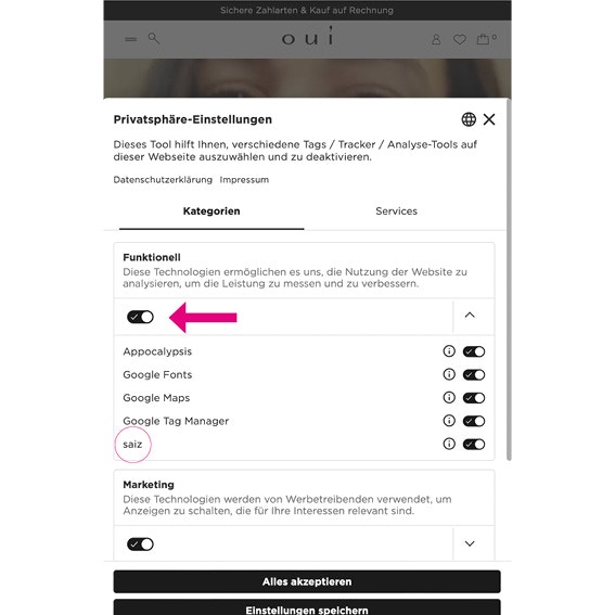 In order for the size guide to be displayed to you, we ask you to tick the box at the bottom of the website in the cookie settings in the Functional category under saiz. You can do this at any time - see screenshot.
