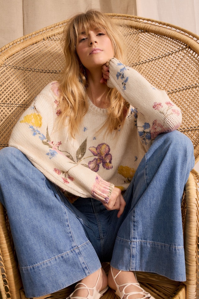 Casual women's pullover: A woman in a floral knit pullover paired with wide-leg jeans. Casual women's pullover: A woman in a floral knit pullover paired with blue jeans, exuding a relaxed vibe. Casual women's pullover: A woman in a floral knit pullover paired with wide-leg jeans, showcasing a relaxed style. Casual women's pullover: Close-up of a woman in a light, floral-patterned knit pullover with distressed details. Casual women's pullover: Young woman in a floral knit pullover, relaxed pose, wearing wide-leg jeans. Bild 6 von Pullover - offwhite red in offwhite red | Oui Floral women's pullover in soft yellow with colorful flower patterns, perfect for casual wear.
